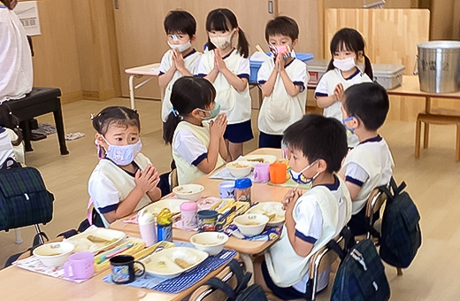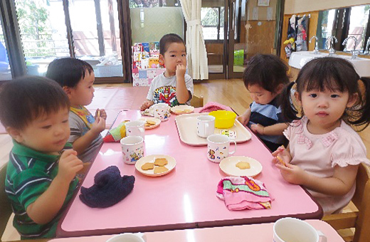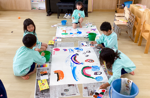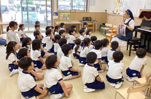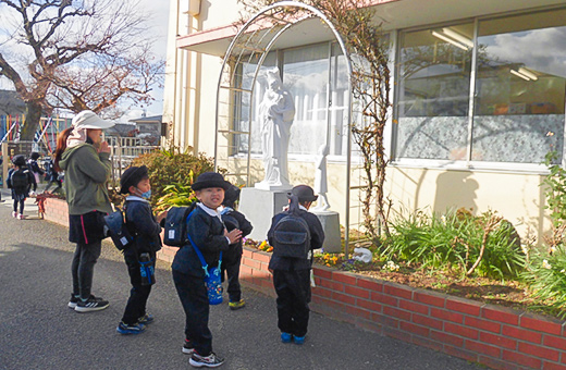 身支度をして朝の集り、お祈りが済んだら、クラスの活動として制作や水遊び、リズム遊び、クッキングなど行います。